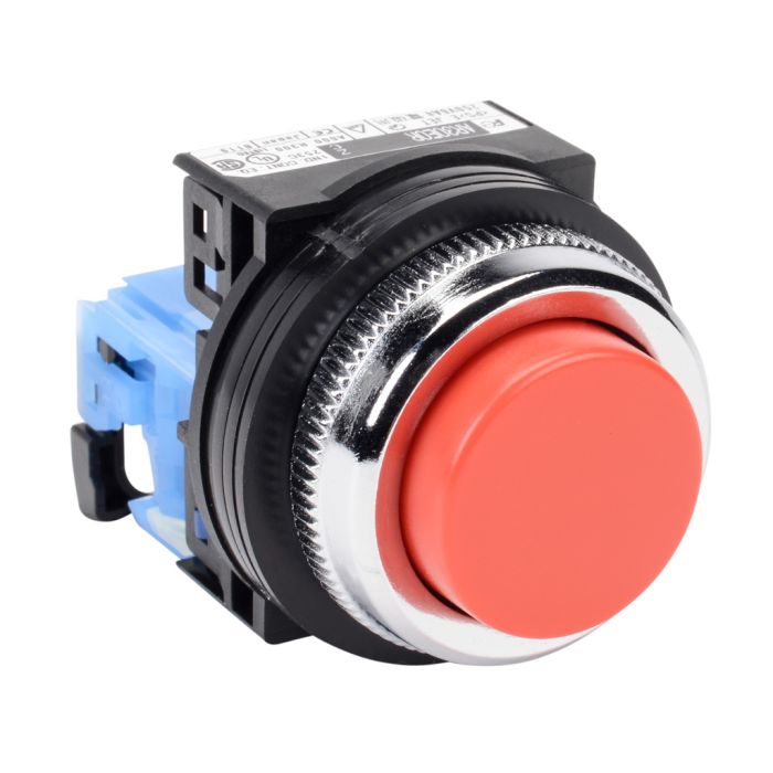 Fuji Electric pushbutton, 30mm, momentary, 1 N.O. contact(s), plastic base, metal bezel, Operator: red, extended, 35mm, round, plastic.