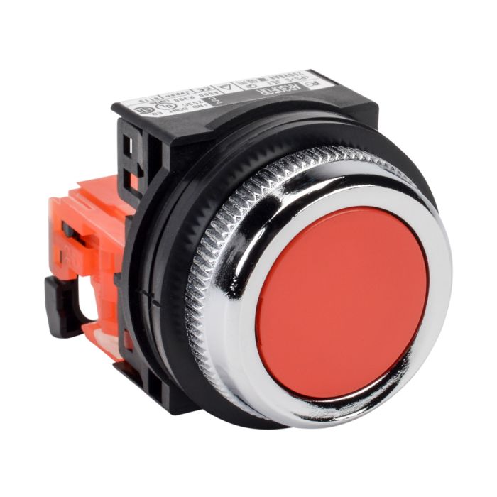 Fuji Electric pushbutton, 30mm, momentary, 1 N.C. contact(s), plastic base, metal bezel, Operator: red, flush, 35mm, round, plastic.