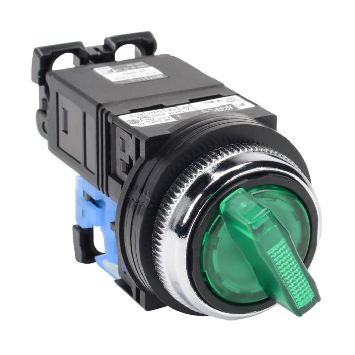 Fuji Electric selector switch, 30mm, 2-position, spring return from right, LED illuminated, 1 N.O. contact(s), plastic base, metal bezel, Operator: green, knob, 35mm, round, plastic, 115-127 VAC, transformer.