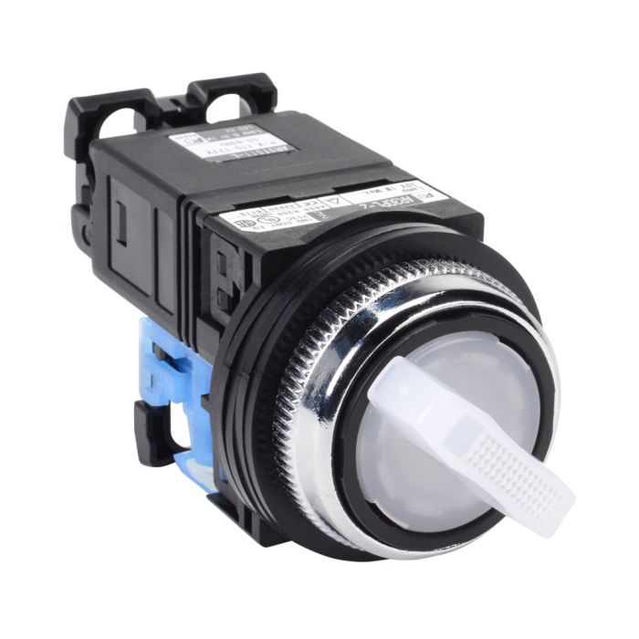 Fuji Electric selector switch, 30mm, 2-position, maintained, LED illuminated, 1 N.O. contact(s), plastic base, metal bezel, Operator: white, knob, 35mm, round, plastic, 115-127 VAC, transformer.