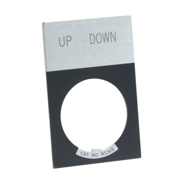 Eaton legend plate, aluminum, black field, silver background, black engraved text, legend plate marking "UP DOWN". For use with 22mm pushbuttons.