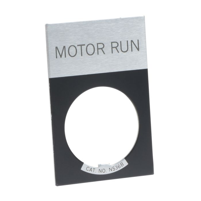Eaton legend plate, aluminum, black field, silver background, black engraved text, legend plate marking "MOTOR RUN". For use with 22mm pushbuttons.
