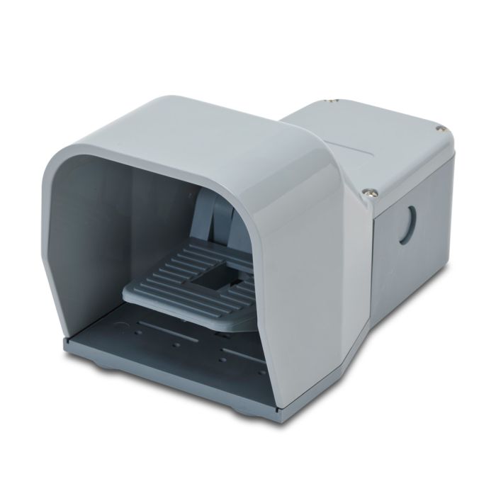 Electric foot switch, single, gray die-cast aluminum foot guard, gray ABS plastic base and pedal, free moving momentary actuating pedal, 2 N.O. and 2 N.C.