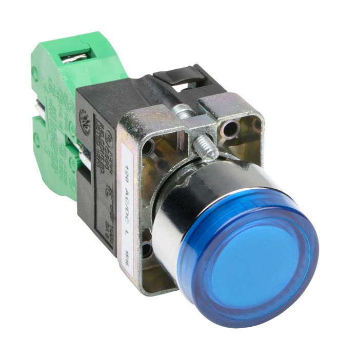 Pushbutton, 22mm, momentary, LED illuminated, 1 N.O. contact(s), metal base, metal bezel, plastic ring, Operator: blue, flush, 30mm, round, plastic, 120V, full voltage.