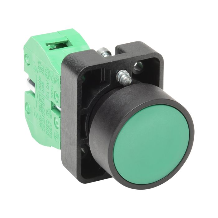 Pushbutton, 22mm, momentary, 1 N.O. contact(s), plastic base, plastic bezel, Operator: green, flush, 30mm, round, plastic.
