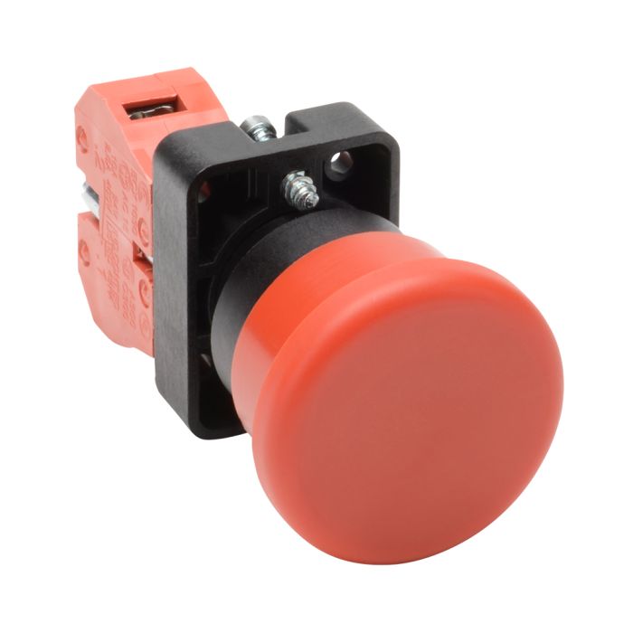 Pushbutton, 22mm, momentary, 1 N.C. contact(s), plastic base, plastic bezel, Operator: red, mushroom, 40mm, round, plastic.