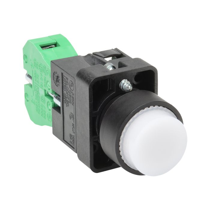 Pushbutton, 22mm, momentary, incandescent illuminated, 1 N.O. contact(s), plastic base, plastic bezel, Operator: white, extended, 30mm, round, plastic, 24V, full voltage.