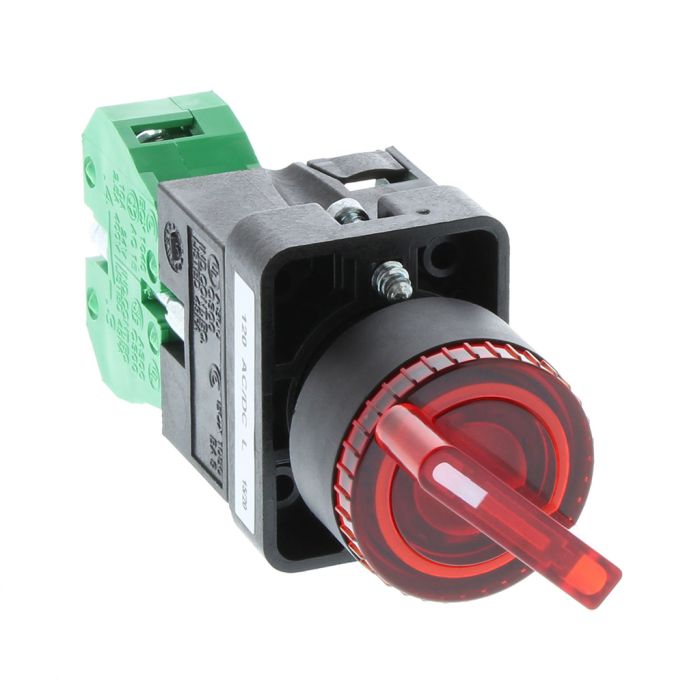 Selector switch, 22 mm, 2-position, maintained, LED illuminated, 1 N.O. contact(s), plastic bezel, Operator: red, knob, 30 mm, round, plastic, 120 VAC/DC, full voltage.