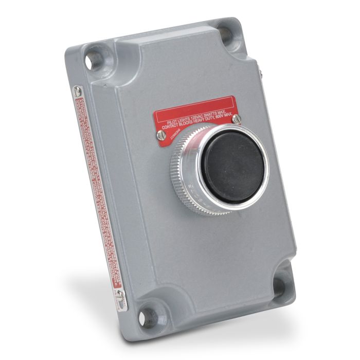 Killark control station cover assembly, hazardous location rated, single pushbutton, momentary, black operator(s), (1) N.O./(1) N.C. contact(s), blank legend plate(s).