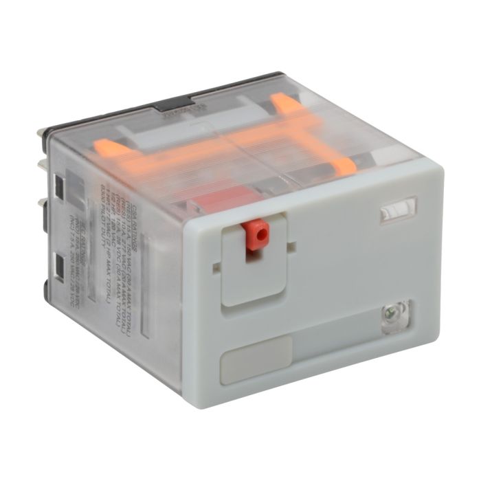 Ice cube control relay, socket mount, 120 VAC coil voltage, 4PDT, 15A contact rating, 14-pin configuration, LED indicator, push-to-test. Purchase 784-4C-SKT-1 mounting socket separately.
