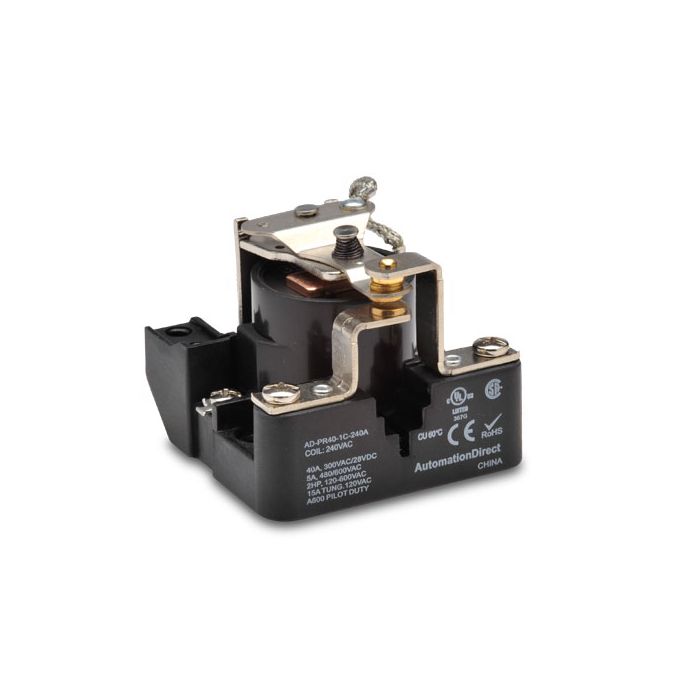 Power relay, open style panel mount, 240 VAC coil voltage, SPDT, 40A contact rating.
