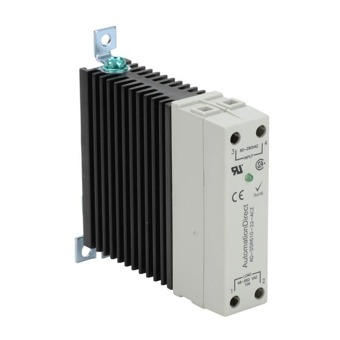 Solid state relay, 35mm DIN rail mount, 90-280 VAC input voltage, SPST, N.O. SCR, 10A contact rating, 48-660 VAC load voltage, zero cross, LED indicator.