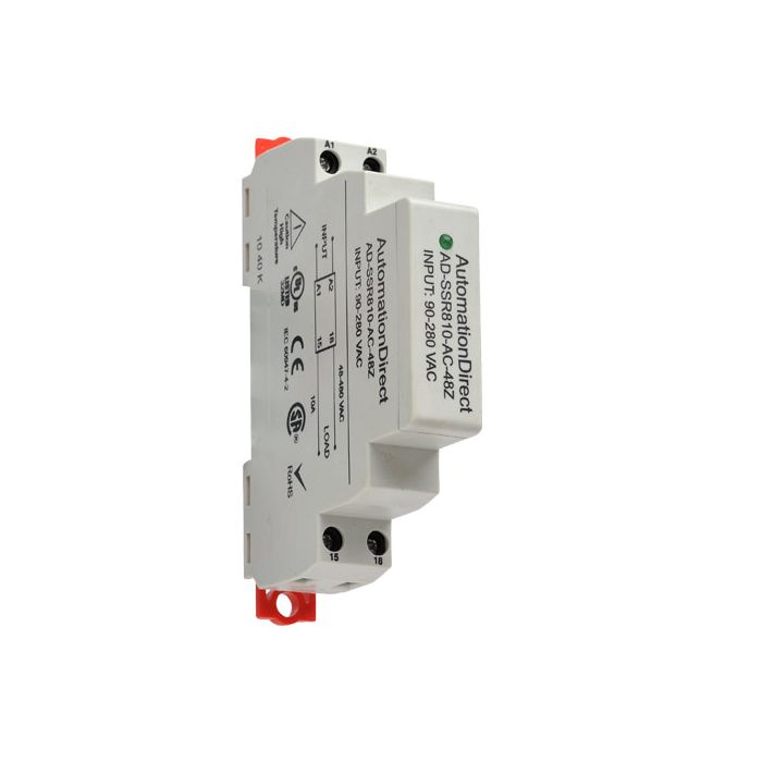Solid state relay, 35mm DIN rail mount, 90-280 VAC input voltage, SPST, N.O. SCR, 10A contact rating, 48-480 VAC load voltage, zero cross, LED indicator.