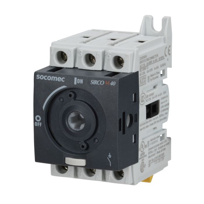 Socomec SIRCO M series rotary disconnect switch, load break capable, 3-pole, 600 VAC, 40A, 65kA SCCR, DIN rail or panel mount, UL 508 rated, front or side operated, accepts 5 x 5mm size shaft.