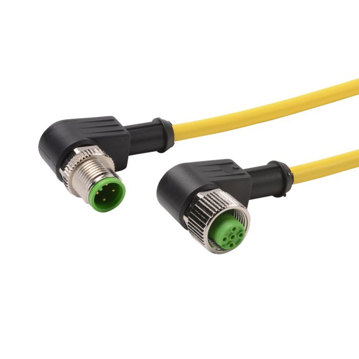 Cordset cable, M12 right-angle male to M12 right-angle female, 4-pole, PUR/PVC jacket, yellow, 9.8ft/3m cable length, IP65 IP66K IP67.