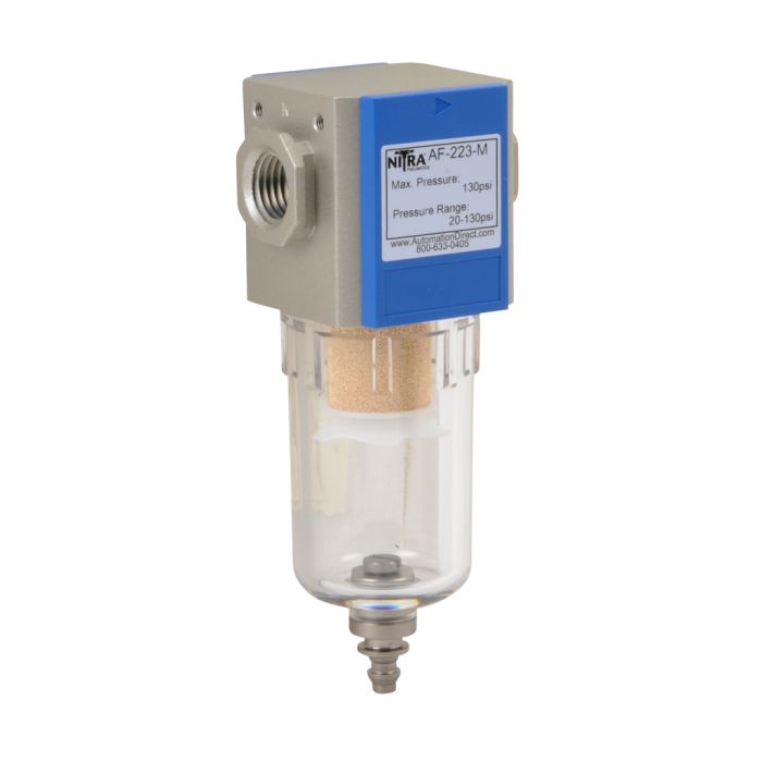 NITRA pneumatic filter, particulate and moisture separation, 1/4in female NPT inlet(s), 1/4in female NPT outlet(s), manual drain, polycarbonate bowl. For use with Ax-22 series air prep components.