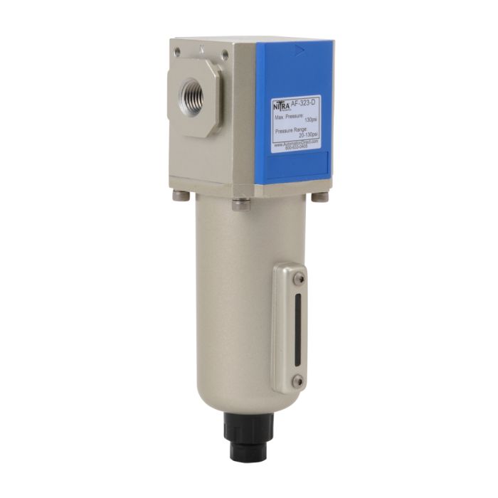 NITRA pneumatic filter, particulate and moisture separation, 1/4in female NPT inlet(s), 1/4in female NPT outlet(s), semi-automatic drain, die-cast aluminum bowl, sight gauge. For use with Ax-32 series air prep components.