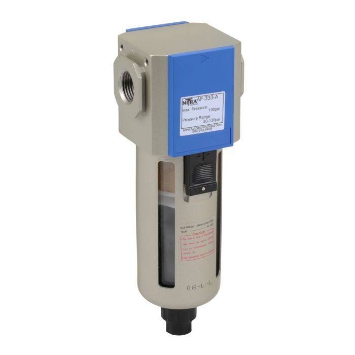 NITRA pneumatic filter, particulate and moisture separation, 3/8in female NPT inlet(s), 3/8in female NPT outlet(s), automatic drain, polycarbonate bowl, metal bowl guard. For use with Ax-33 series air prep components.
