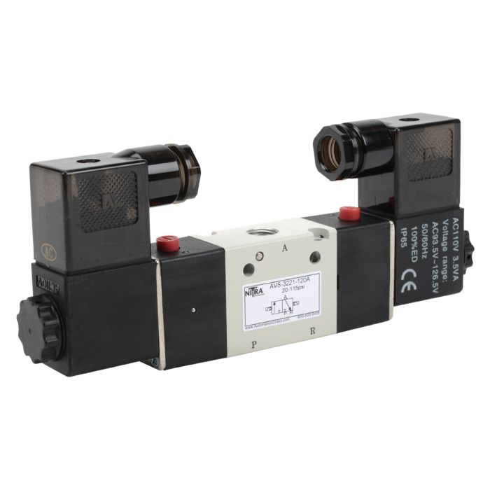 NITRA solenoid valve, 3-port (3-way), 2-position, double solenoid, (1) 1/8in FNPT inlet(s), (1) 1/8in FNPT outlet(s), (1) 1/8in FNPT exhaust(s), Cv=0.78, 120 VAC, 3.5VA, 11mm DIN style wiring plug.
