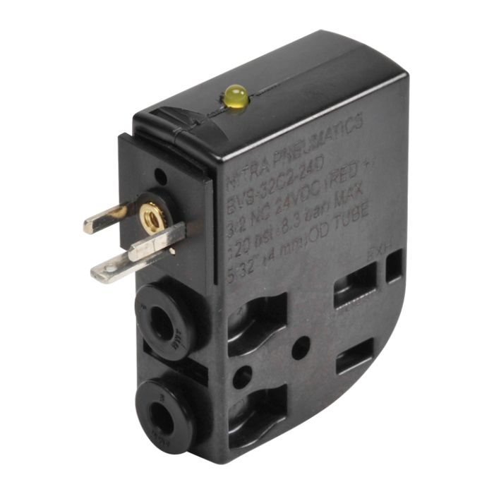 NITRA solenoid valve, 3-port (3-way), 2-position, N.C., single solenoid spring return, (1) 5/32in (4mm) PTC tubing inlet(s), (1) 5/32in (4mm) PTC tubing outlet(s), (1) vent hole exhaust(s), Cv=0.02, 24 VDC, 1.2W, 8mm DIN style wiring plug.
