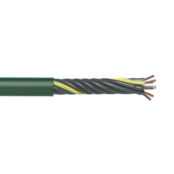 igus continuous flexing multi-conductor control cable, 7 conductors (includes ground), 1.50mm2 (16 AWG), PVC conductor insulation material, unshielded, PVC jacket, green, 50ft coil.