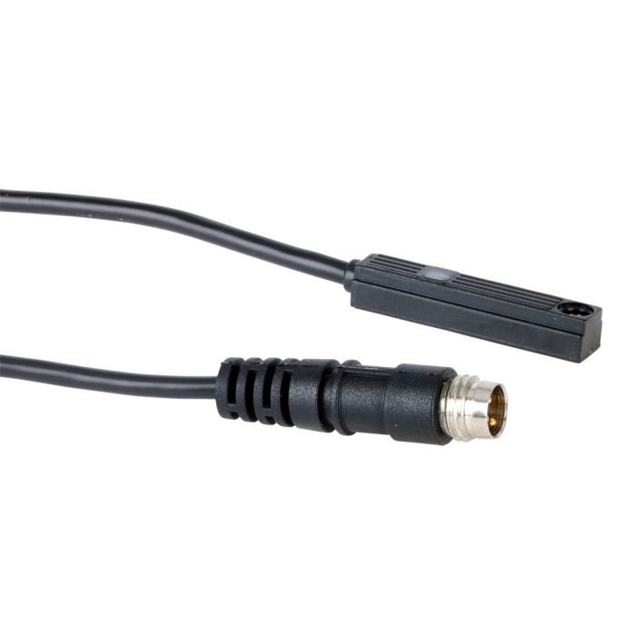 NITRA cylinder switch, rectangular, PNP, N.O. output, 5-28 VDC operating voltage, LED indication, 0.5ft (0.15m) cable with 3-pin M8 snap-fit connector, 7.2 x 3.9mm T-slot mount, for position sensing.