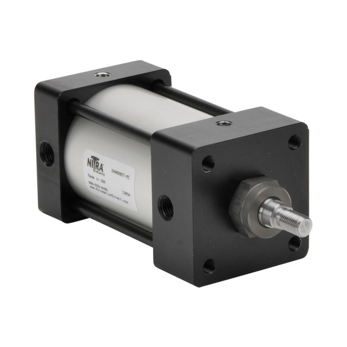 NITRA pneumatic air cylinder, NFPA tie rod, 2-1/2in bore, 2in stroke, double acting, magnetic piston, front and rear adjustable cushions, tapped end caps mount.