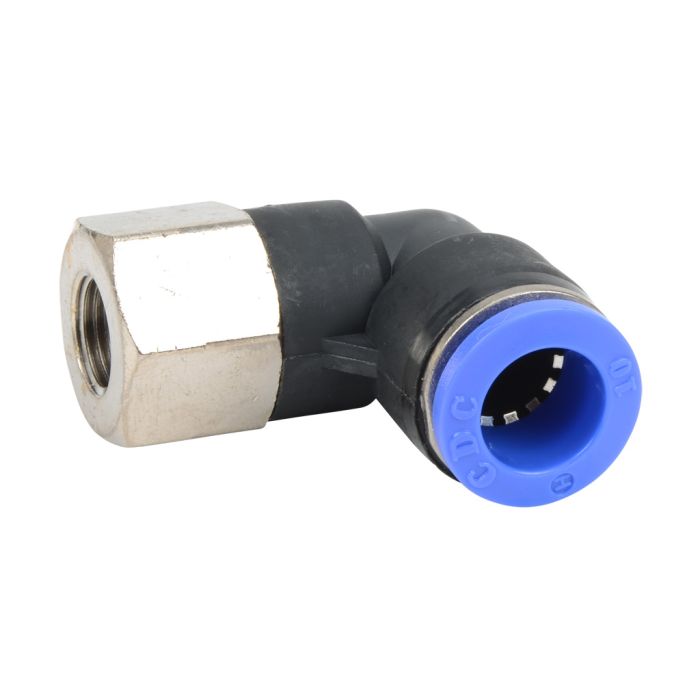 NITRA pneumatic push-to-connect fitting, female, elbow, rotating, thermoplastic (PBT) body, nickel-plated brass threads, 10mm tube to R1/8 BSPT connection(s). Package of 5.
