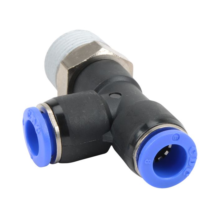 NITRA pneumatic push-to-connect fitting, male, run tee, rotating, thermoplastic (PBT) body, nickel-plated brass threads, (2) 5/16in (8mm) tube to R3/8 BSPT connection(s). Package of 5.