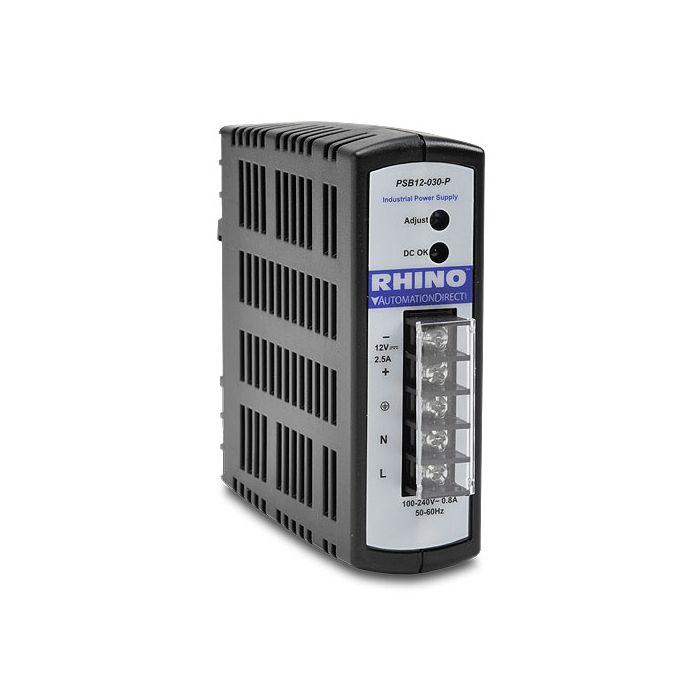RHINO switching power supply, 12VDC, 30W output, 85-264 VAC / 120-375 VDC input, plastic case, 35mm DIN rail mounting, screw terminals.