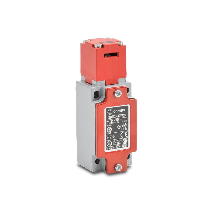 Comepi safety switch, tongue (key), 3 N.C. contact(s), slow action, plastic head, die-cast aluminum body, 40 mm wide, 1/2 inch female NPT conduit entry(s), IP66.