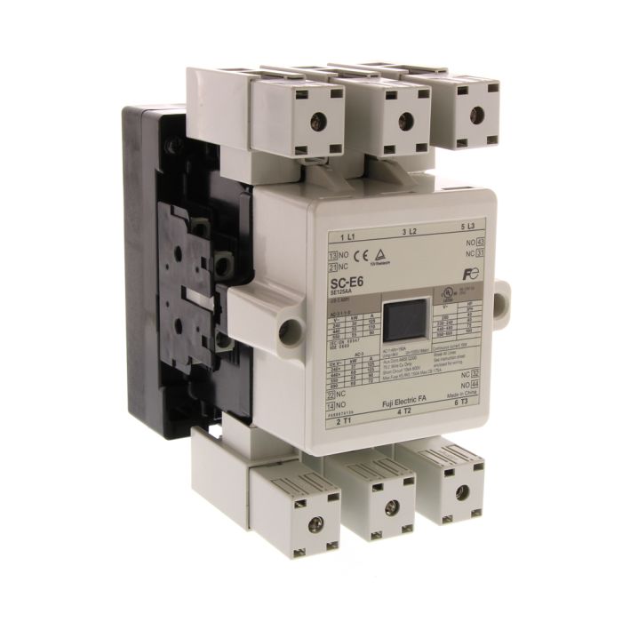Fuji Electric IEC contactor, 125A, (3) N.O. power poles, 450 VAC (60Hz)/380 VAC (50Hz) coil voltage, low consumption electronic. (2) N.O. and (2) N.C. auxiliary contacts included.