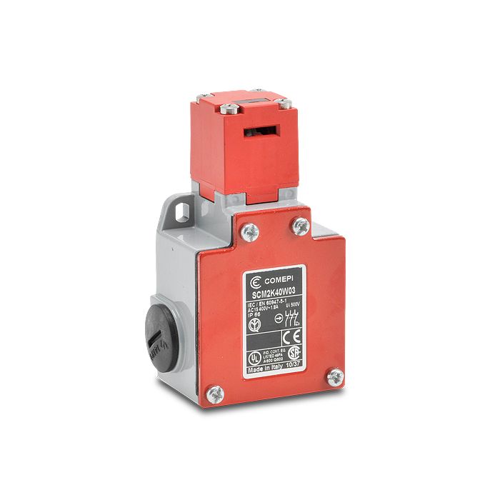 Comepi safety switch, tongue (key), 3 N.C. contact(s), slow action, plastic head, die-cast aluminum body, 60 mm wide, (3) 1/2 inch female NPT conduit entry(s), IP66.
