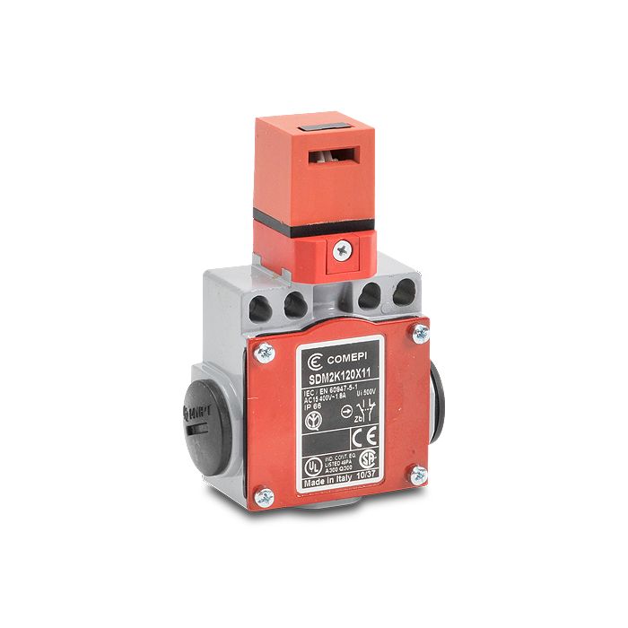 Comepi safety switch, tongue (key), 360-degree adjustable head, 1 N.O. / 1 N.C. contact(s), slow action break before make, plastic head, die-cast aluminum body, 50 mm wide, (3) 1/2 inch female NPT conduit entry(s), IP66.