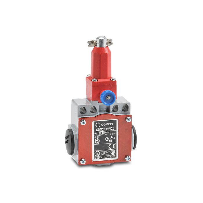 Comepi safety switch, cable-pull interlock, with reset, protection to 15 meters, 2 N.C. contacts with slow action, 50mm wide.