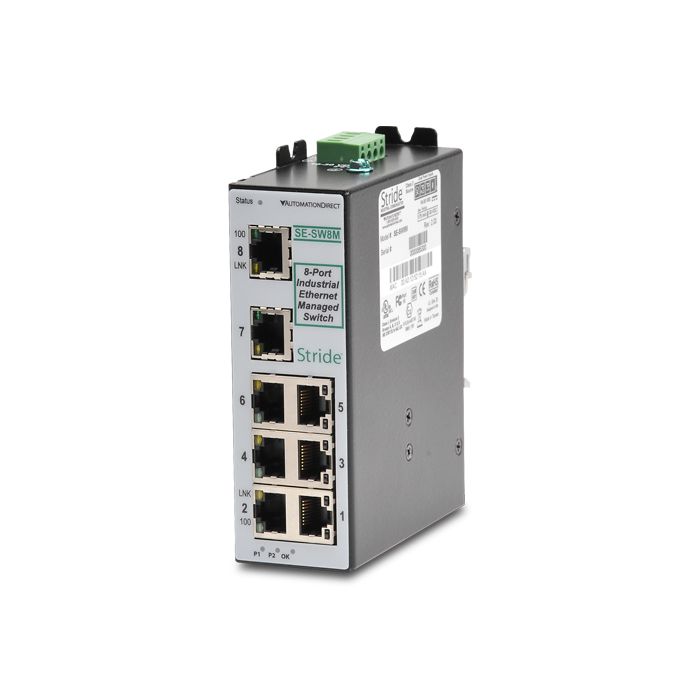 STRIDE SlimLine industrial managed 8-port Ethernet switch, metal housing, -40 to +75 deg. C, (8) 10/100BaseT RJ45 ethernet ports, hazardous locations.