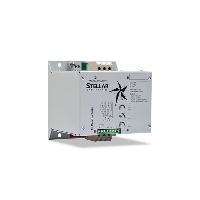 Stellar SR33 series basic reduced voltage soft starter, 55A, 208-230/460 VAC, for 3-phase motors (two phases controlled), rated for 10 starts/hour.