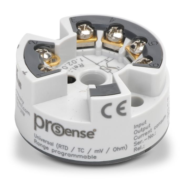 ProSense universal programmable temperature transmitter, RTD or thermocouple input, 4-20 mA output, programmable range, 8 to 35 VDC, connection head mount.