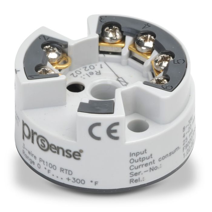 ProSense temperature transmitter, 3-wire Pt100 RTD input, 4-20 mA output, 0 to 300 deg. F fixed range, 8 to 35 VDC loop powered, connection head mount.