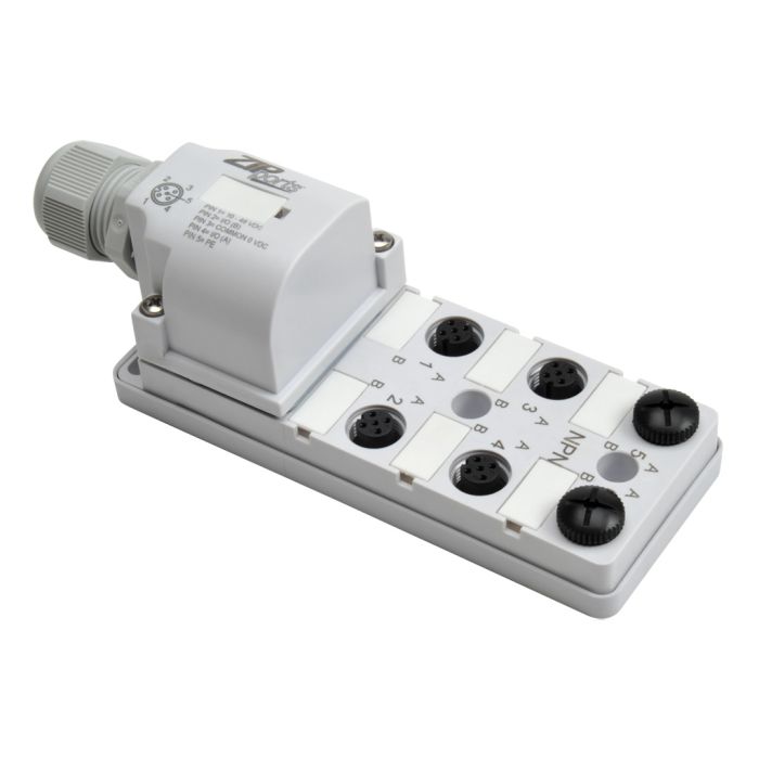 ZIPport junction block, 6 ports with M12 sockets rated 48 VDC max and 3 amps each, 5-pin with (2) I/O per socket, power and NPN LED , field wired connection.