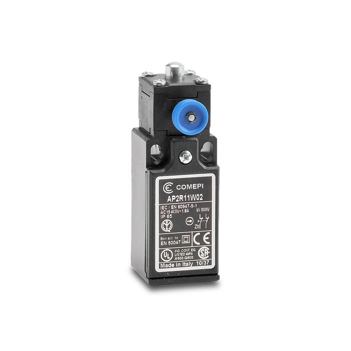 Comepi safety limit switch, steel plunger, 2 N.C. contact(s), slow action, plastic head, plastic body, 30 mm wide, 1/2 inch female NPT conduit entry(s).