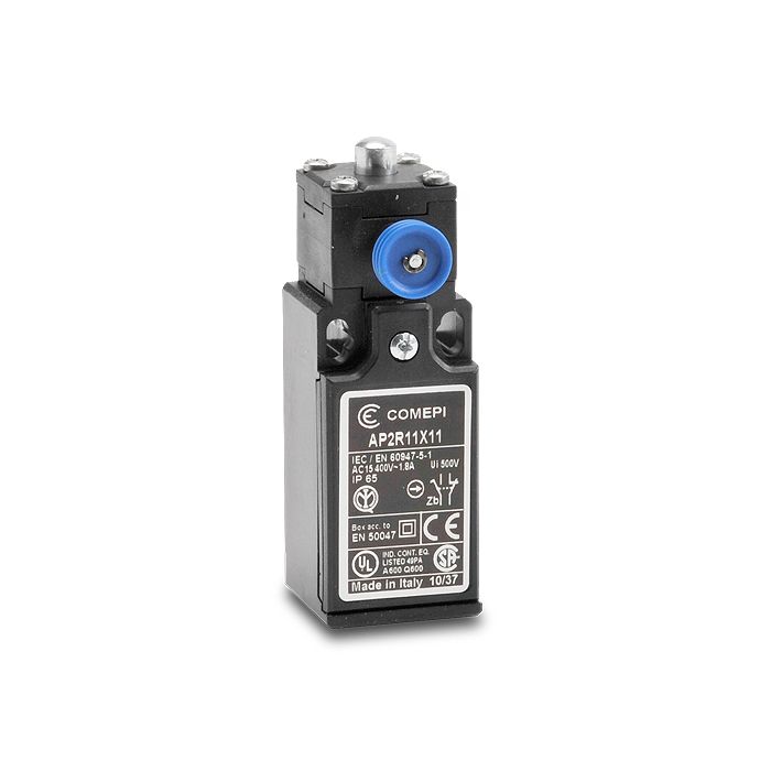 Comepi safety limit switch, steel plunger, 1 N.O. / 1 N.C. contact(s), slow action break before make, plastic head, plastic body, 30 mm wide, 1/2 inch female NPT conduit entry(s).