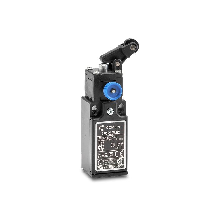Comepi safety limit switch, steel plunger, one-way vertical nylon roller arm lever actuator, 2 N.C. contact(s), slow action, 1/2 inch female NPT conduit entry(s).