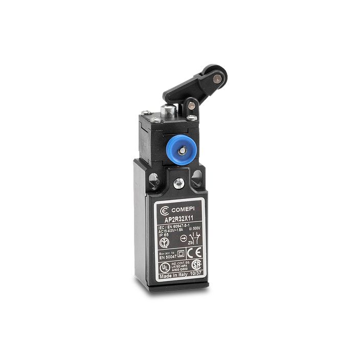 Comepi safety limit switch, steel plunger, one-way vertical nylon roller arm lever actuator, 1 N.O. / 1 N.C. contact(s), slow action break before make, plastic head, plastic body, 30 mm wide, 1/2 inch female NPT conduit entry(s).
