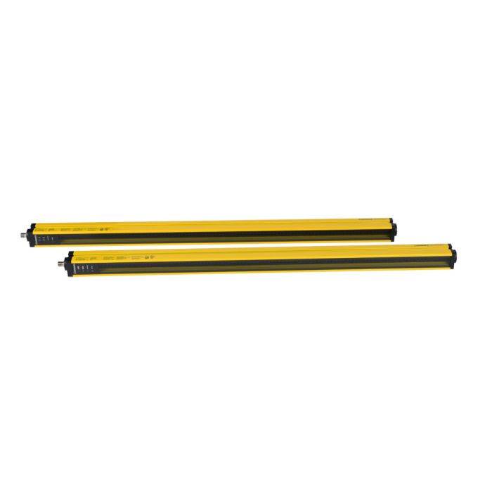 Contrinex safety light curtain, sender/receiver pair, finger protection, 24 VDC, 14mm resolution, 787mm protected height, 3.5m operating distance, safety category Type 4, (2) OSSD outputs, IP65 IP67, (2) 5-pin M12 quick-disconnects.