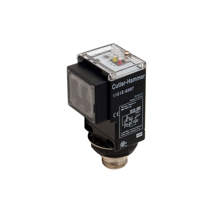 Eaton photoelectric sensor, rectangular, plastic housing, through-beam emitter, infrared light emission, 500 ft sensing distance, 10-40 VDC, 4-wire, 4-pin mini connector and 7/8in - 16UNF thread.
