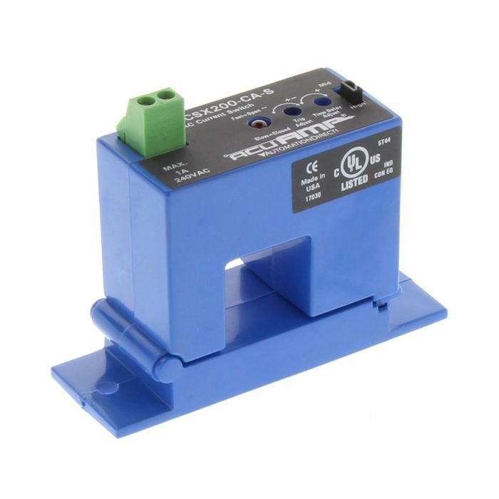 AcuAMP single-phase AC adjustable current switch, split core, 2-12, 12-55, or 55-200A input ranges, N.C. 1A @ 240VAC time adjustable output.