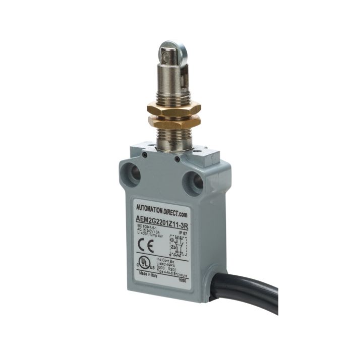Compact limit switch, metal plunger with metal roller and fixing nuts, (1) N.O./(1) N.C. contact(s), snap action, 35mm wide body, pigtail, 9.8ft/3m cable length, right exit.