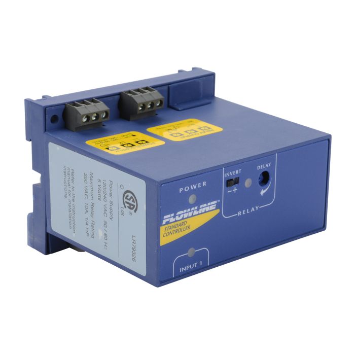 Flowline Switch-Pro remote level controller, one level switch input, one SPDT relay output, 0-60 second relay delay, 120VAC, 35mm DIN rail mounting.