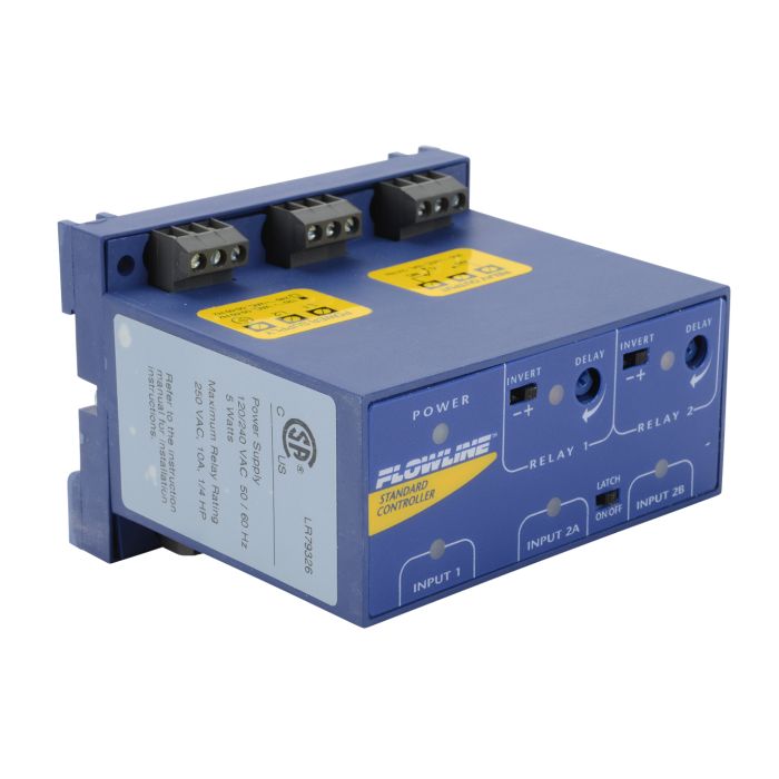 Flowline Switch-Pro remote level controller, three level switch inputs, two SPDT relay outputs (one latching), adjustable 0-60 second relay contact delay, LED indicators for level switch, power and relay status, powered by 120VAC, polypropylene (PP) housing with removable terminal strips and integral 35mm DIN rail mounting.
